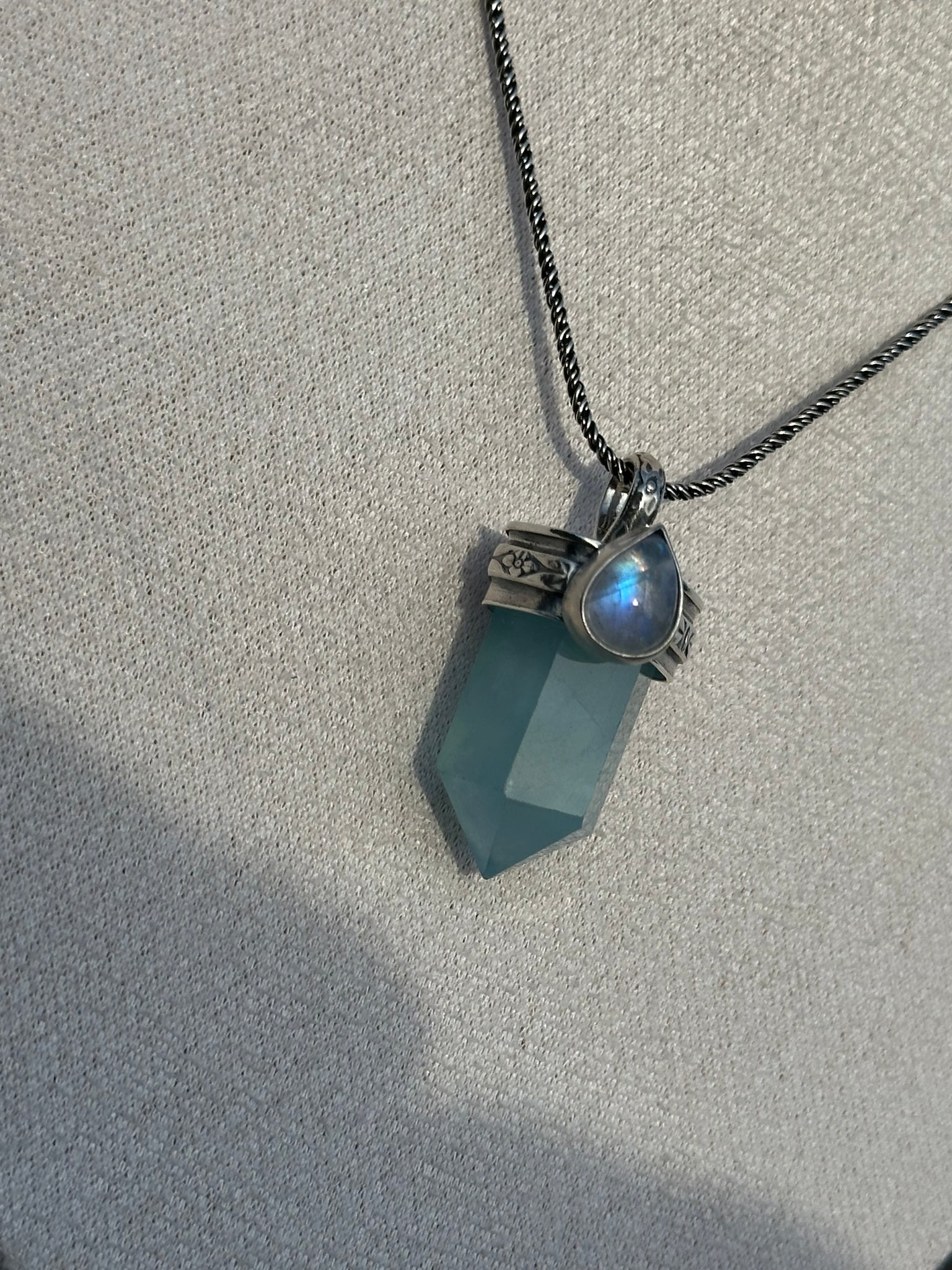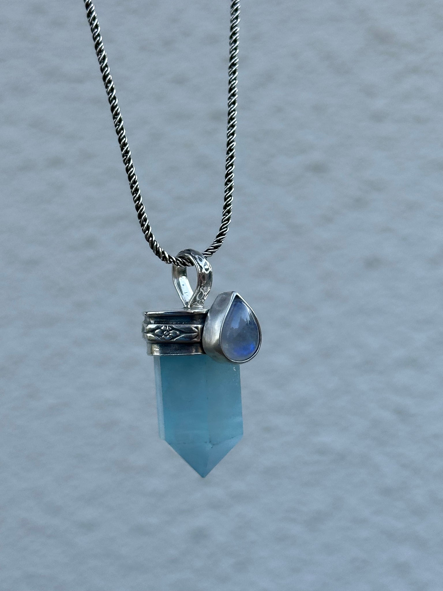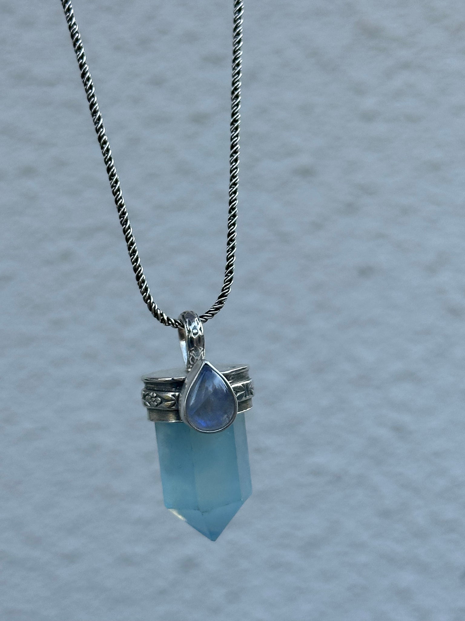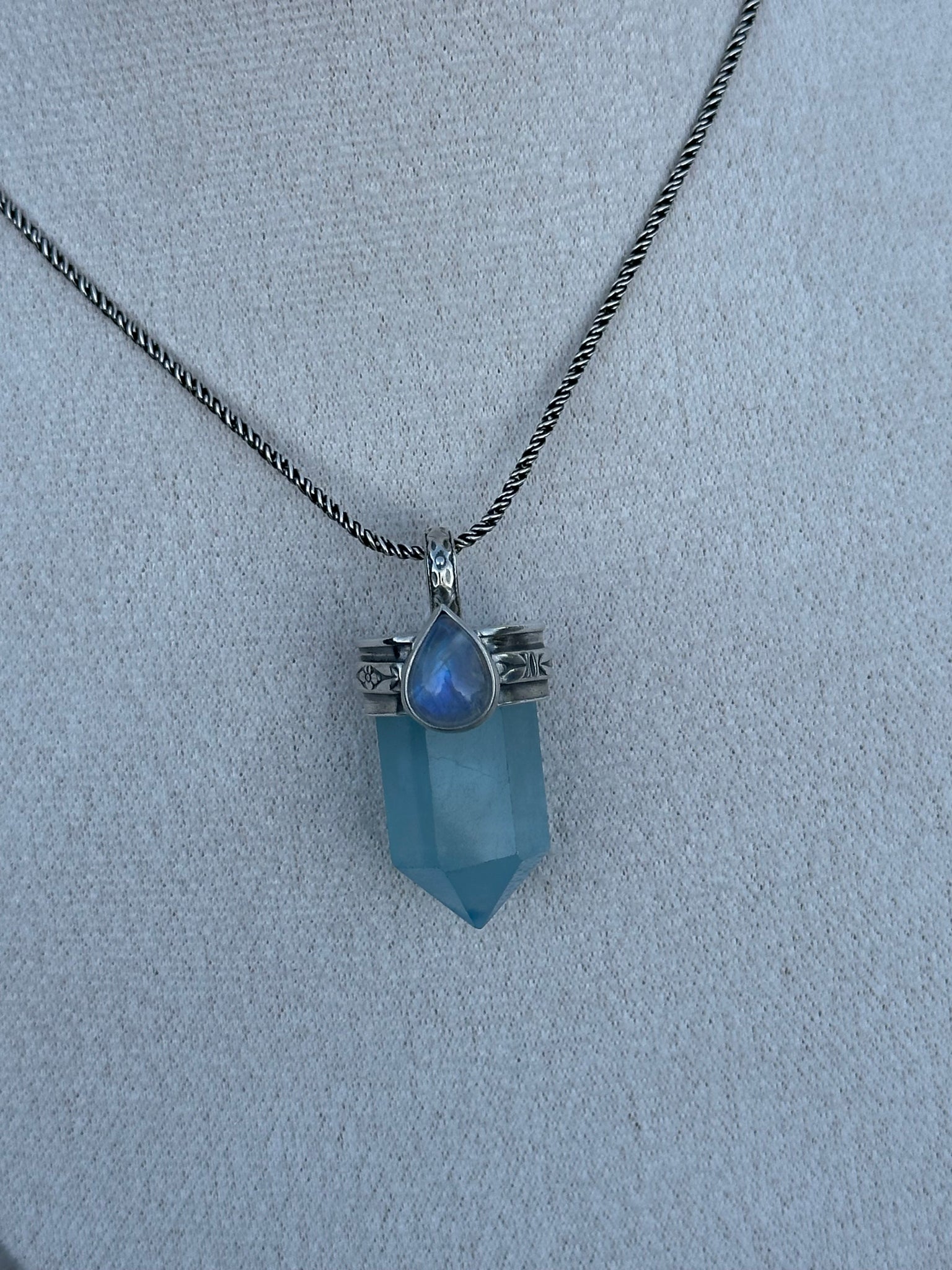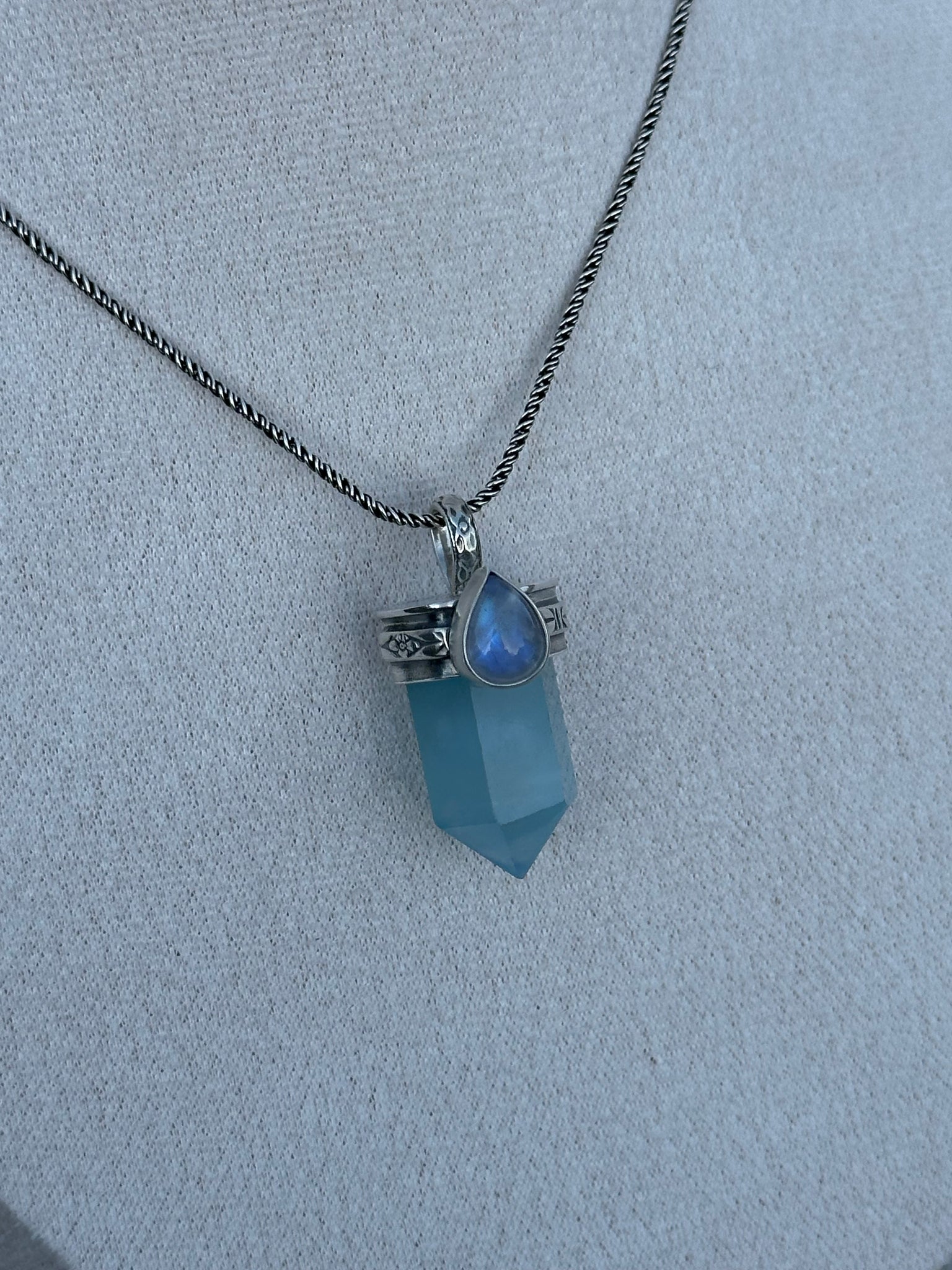 A beautiful blue Aquamarine Crystal point ft. A patterned topper with flashy Moonstone teardrop
