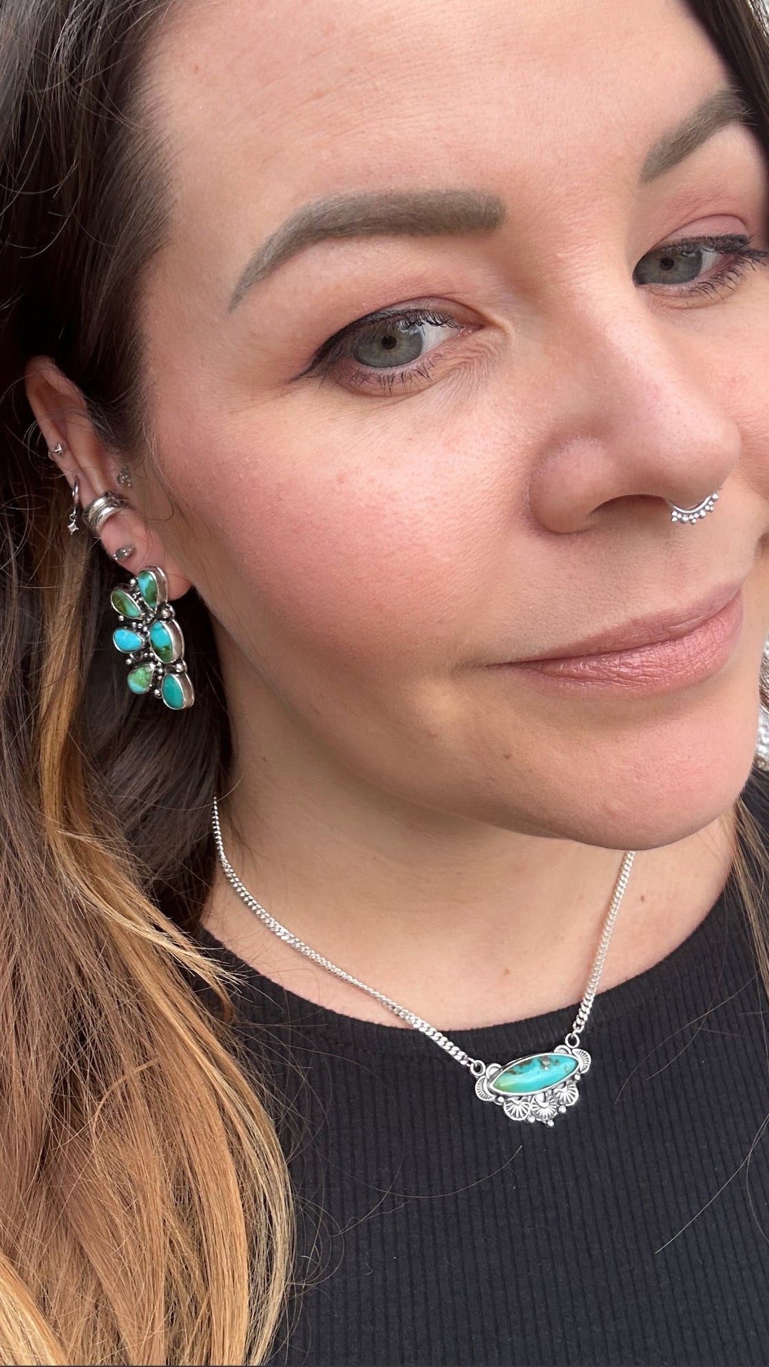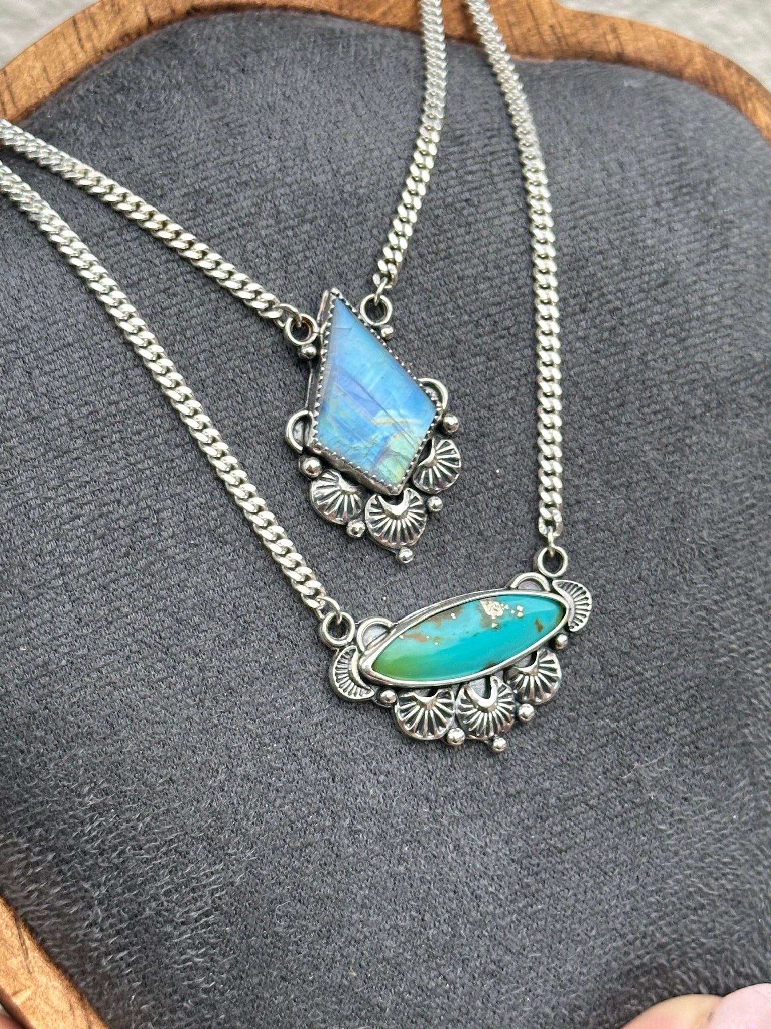 A stunning Campitos Turquoise with Pyrite inclusions ft. Stamped embellishments attached to a flat style curb chain