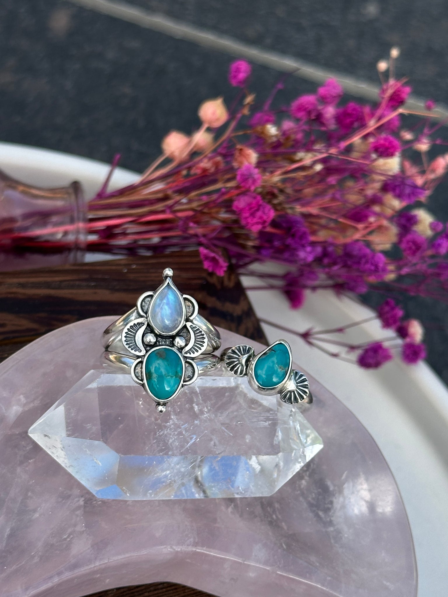 A mini US mined Turquoise set on a thick rounded band ft. Crescent stamps