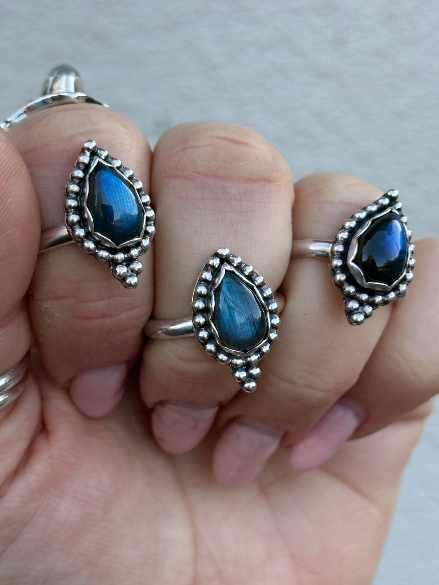 A rich blue flash Labradorite teardrop set in sterling silver with beading detail
