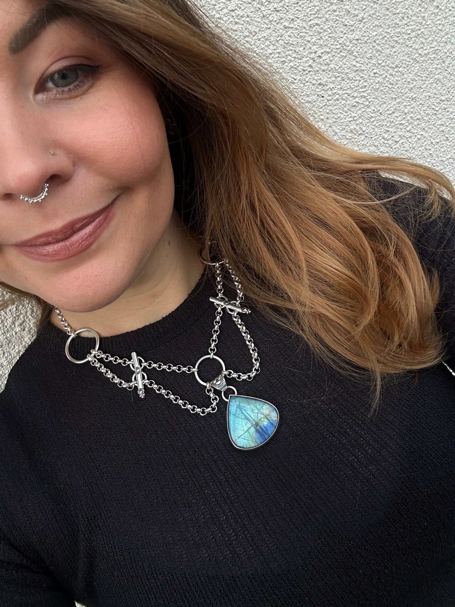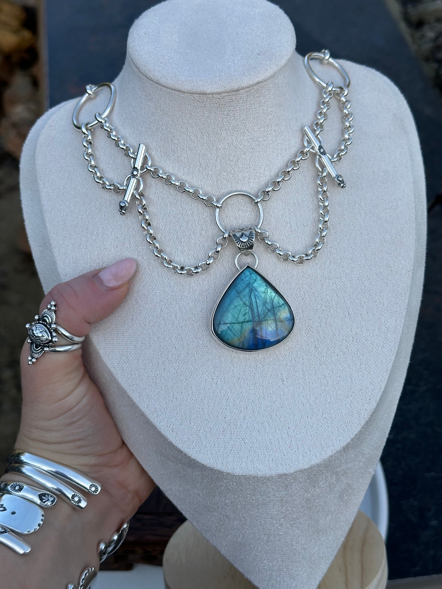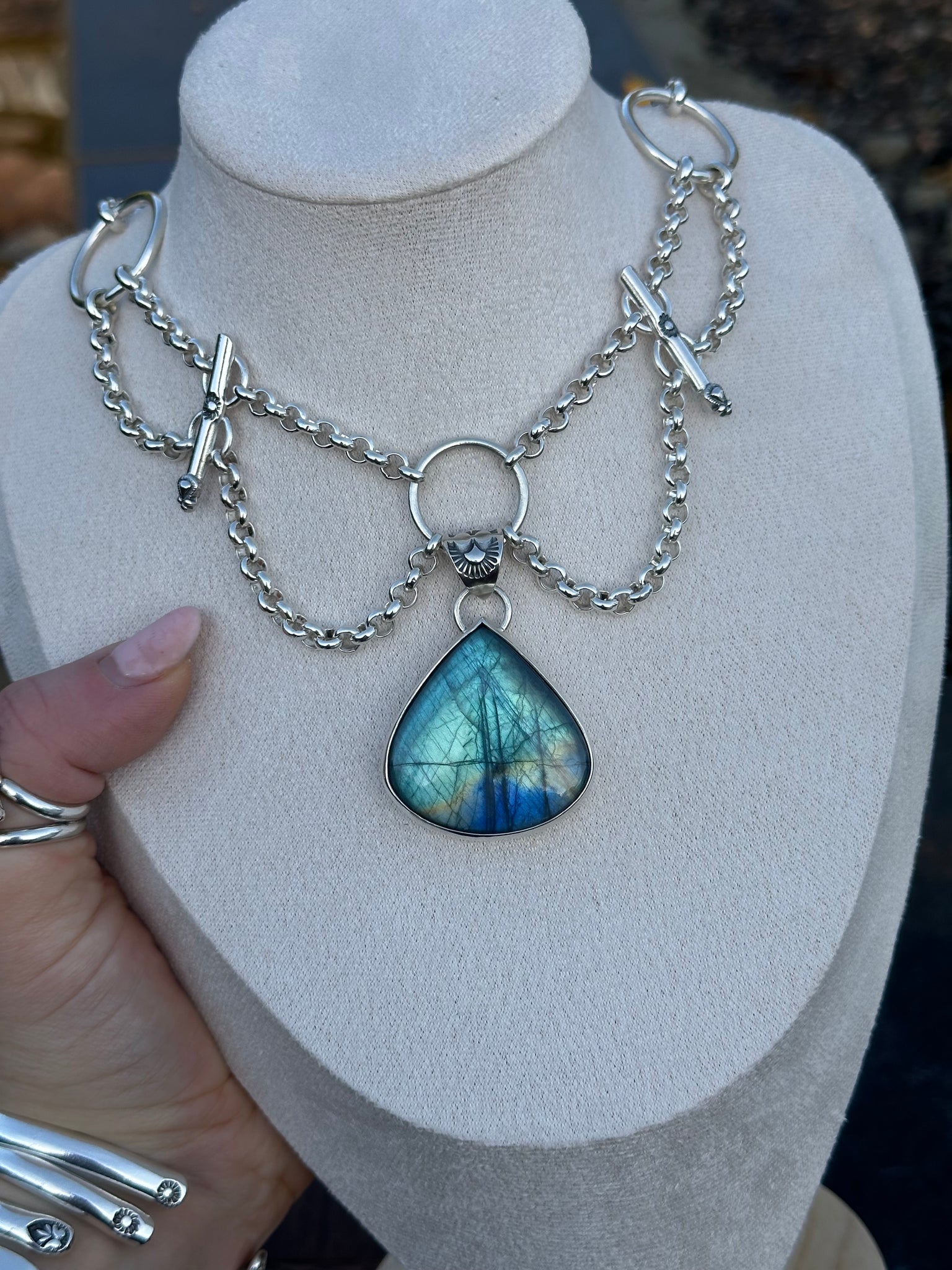 A statement adornment for your neck! Chandelier chains hung from chunky O~rings and stamped components ft. A heavy stamped bail and front~flash blue Labradorite