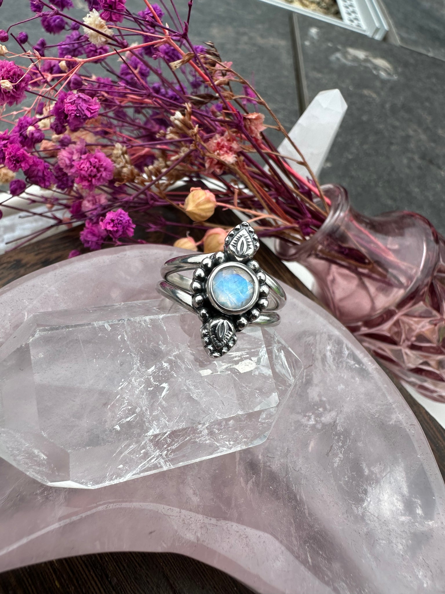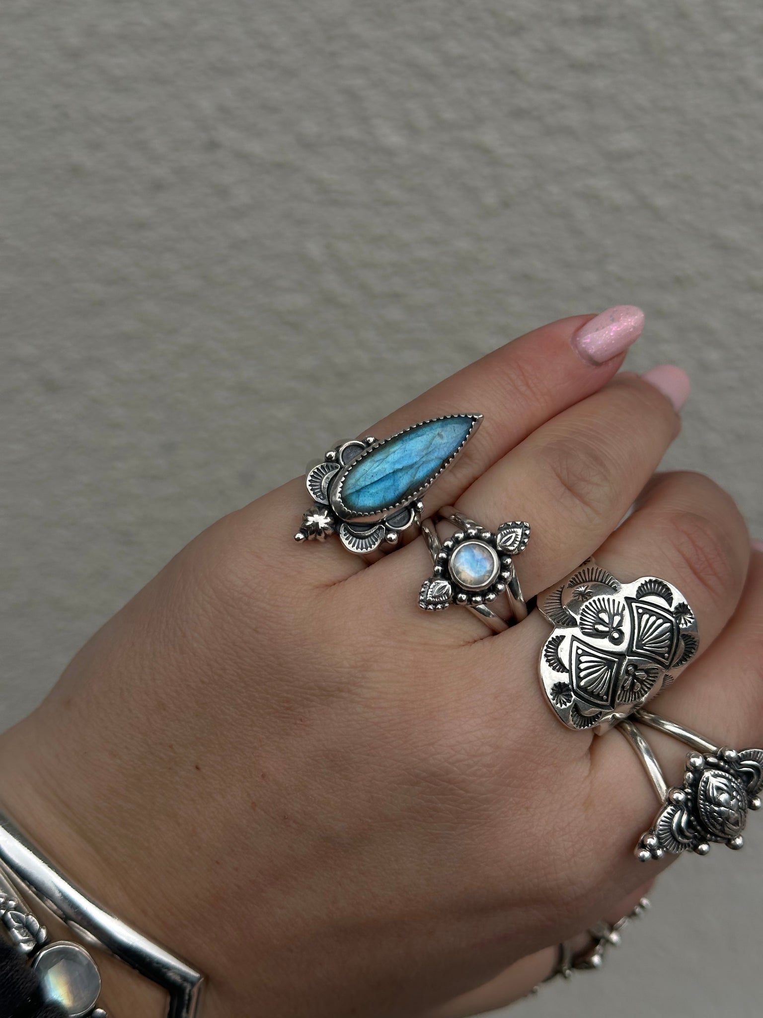 A flashy, faceted Moonstone between Paisley stamped and beading detail