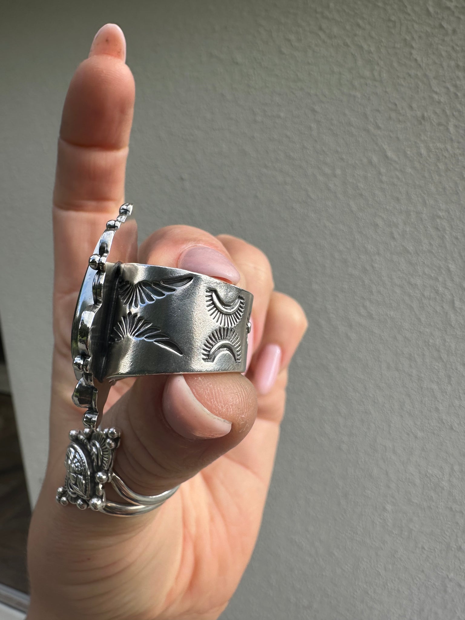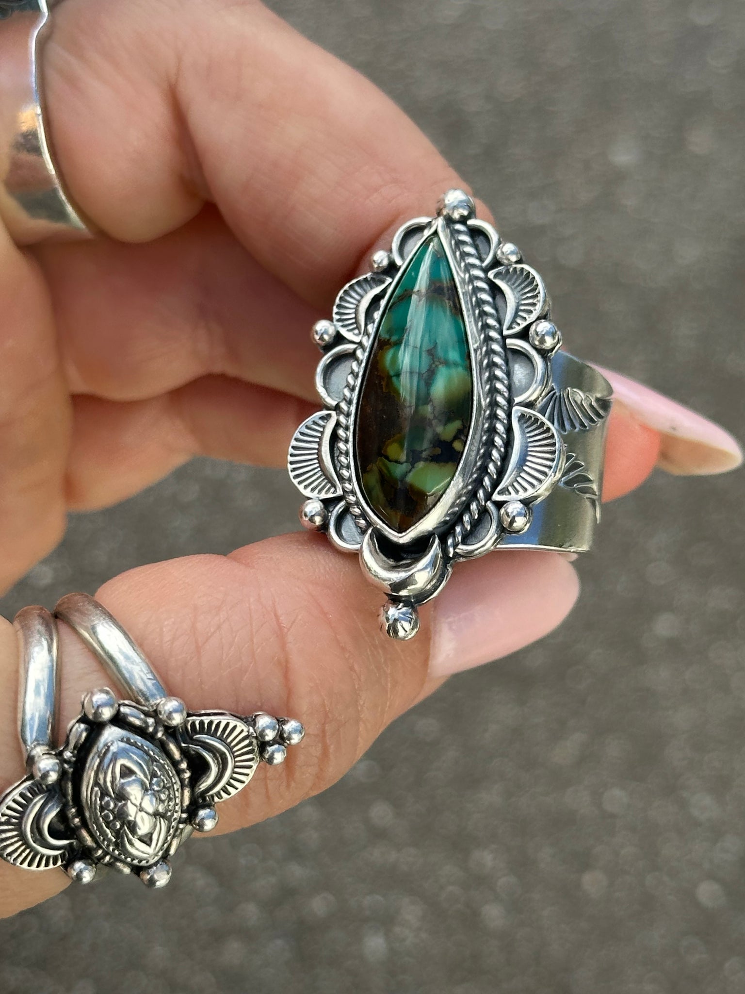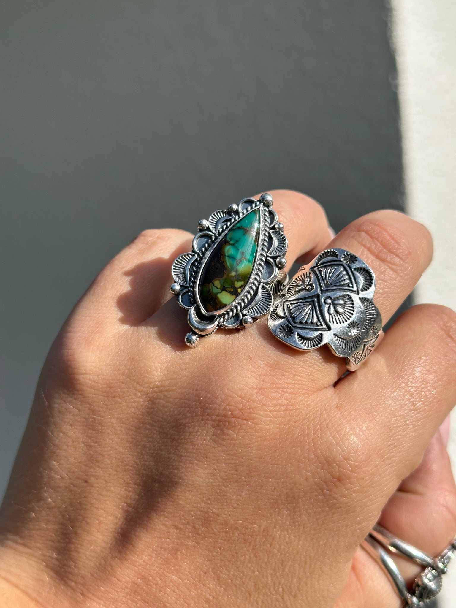 A Polychrome Qingu Turquoise set with silver embellishment & stamp details