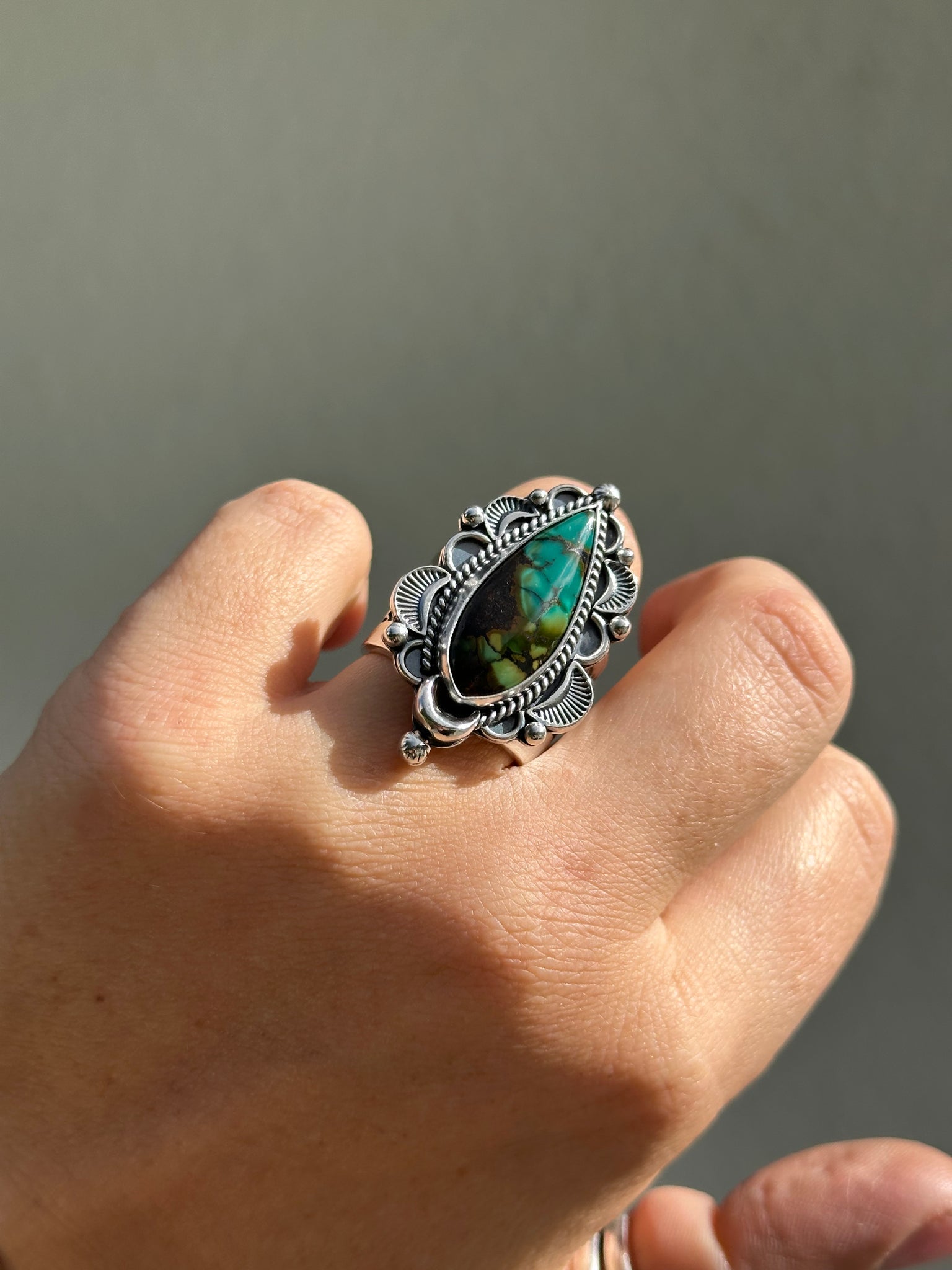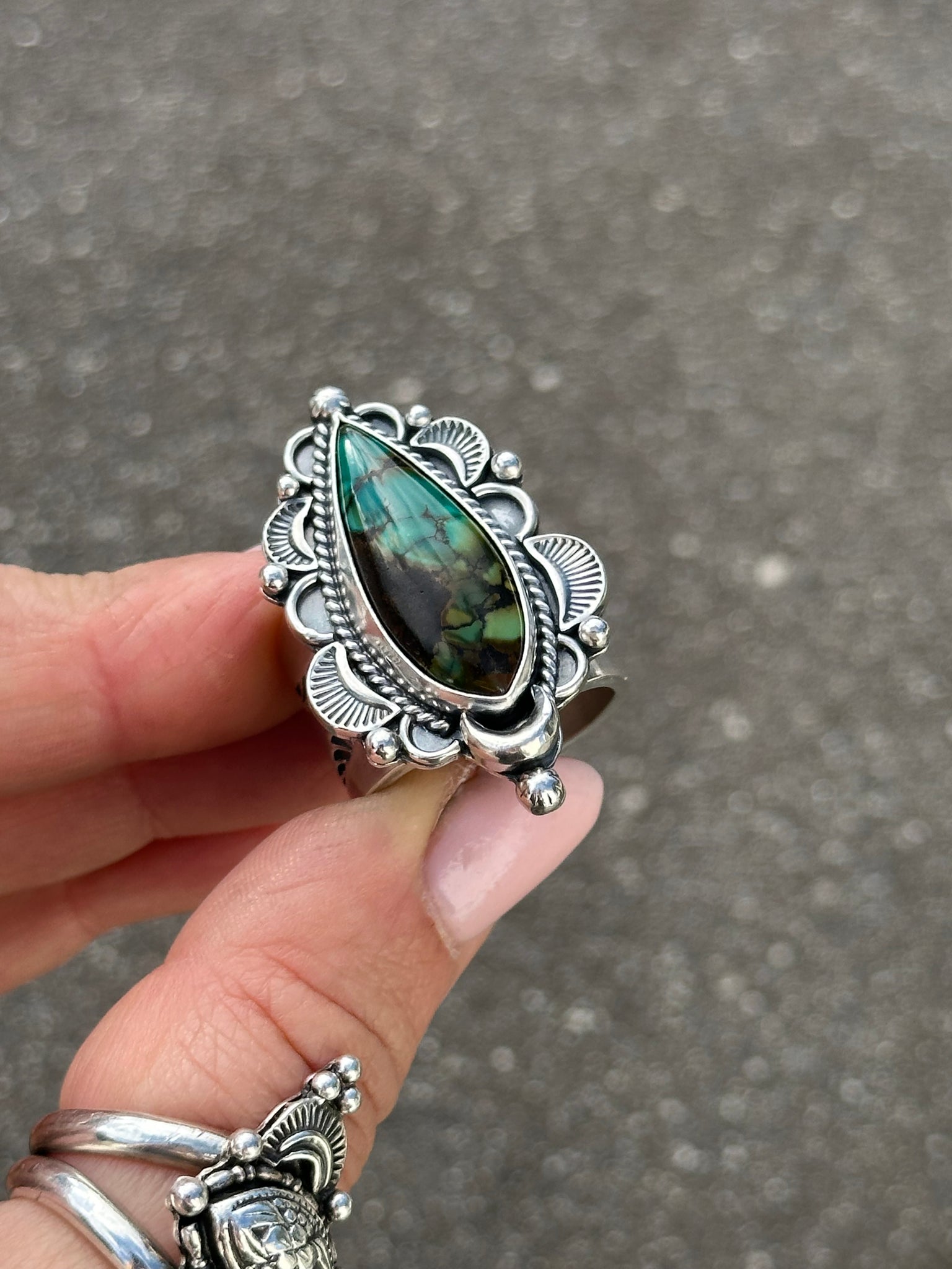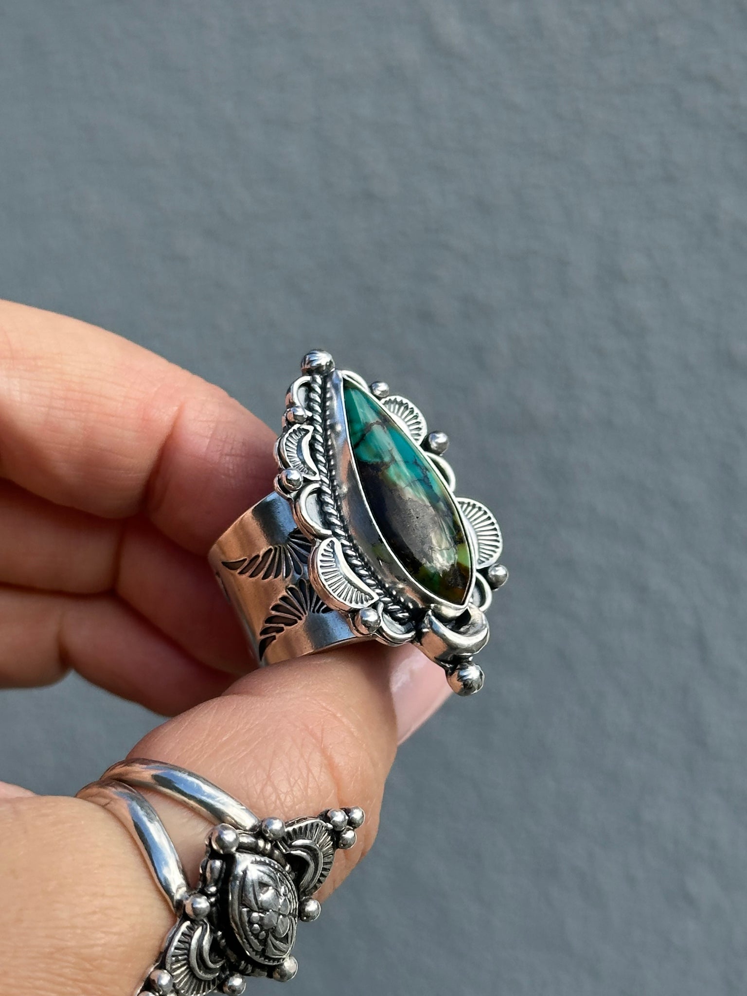 A Polychrome Qingu Turquoise set with silver embellishment & stamp details