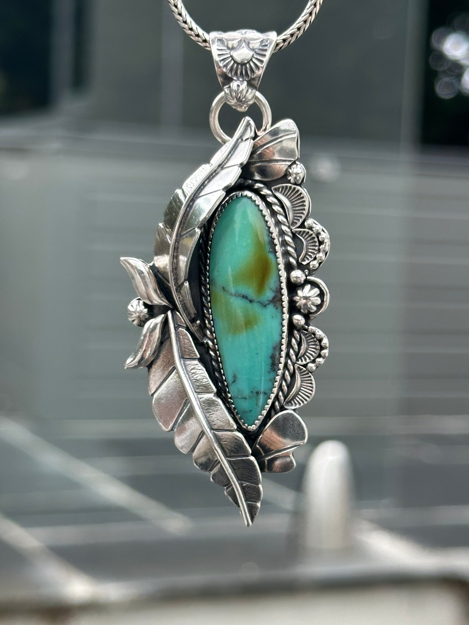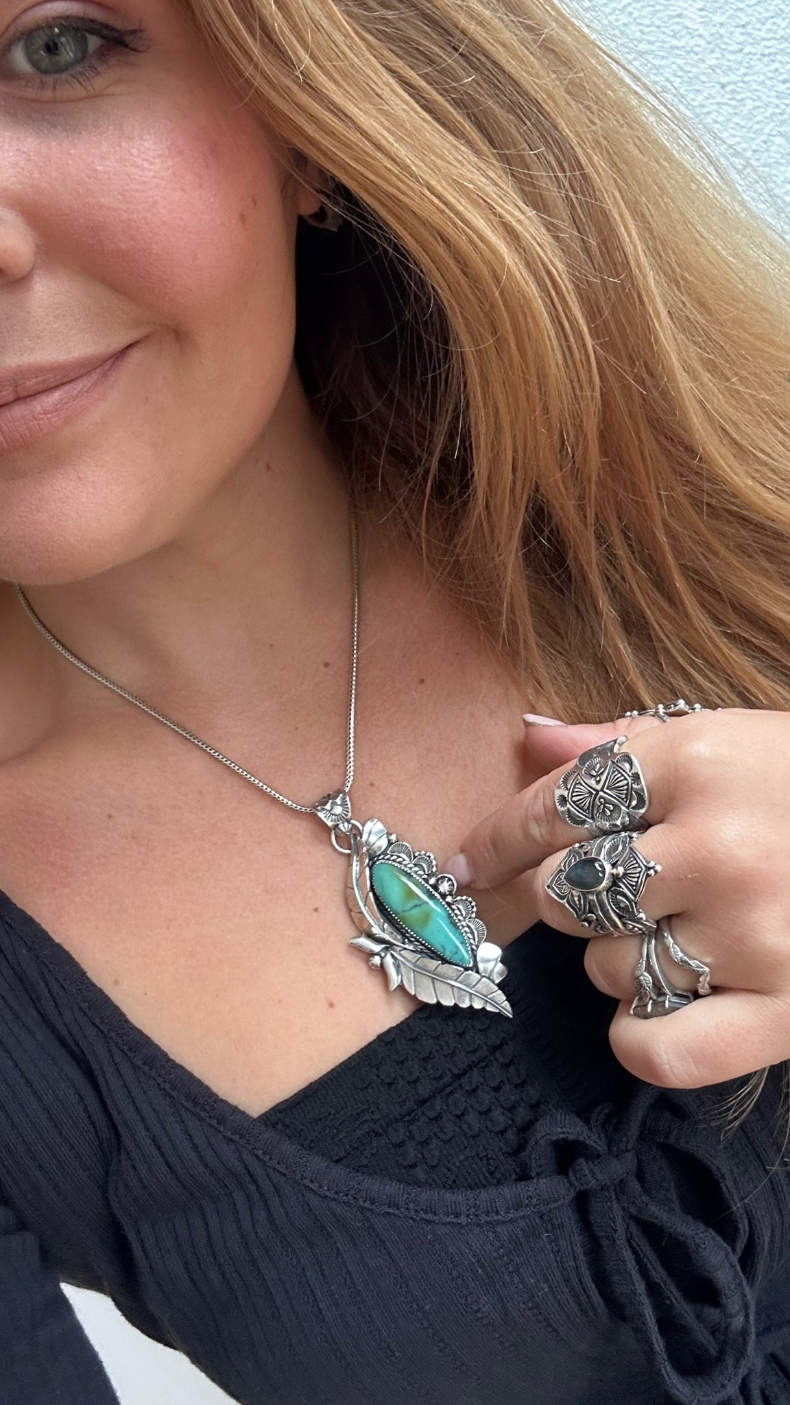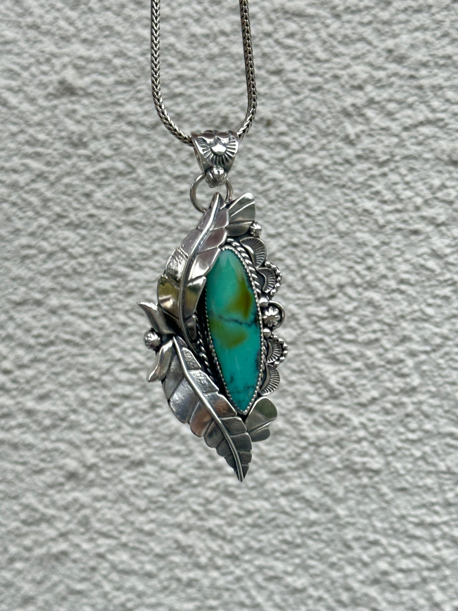 A totally unique vibrant Campitos Turquoise Talon surrounded by silver stamps, leaves & detailing hung from a chunky stamped bail & thick silver snake chain measuring 17.5”