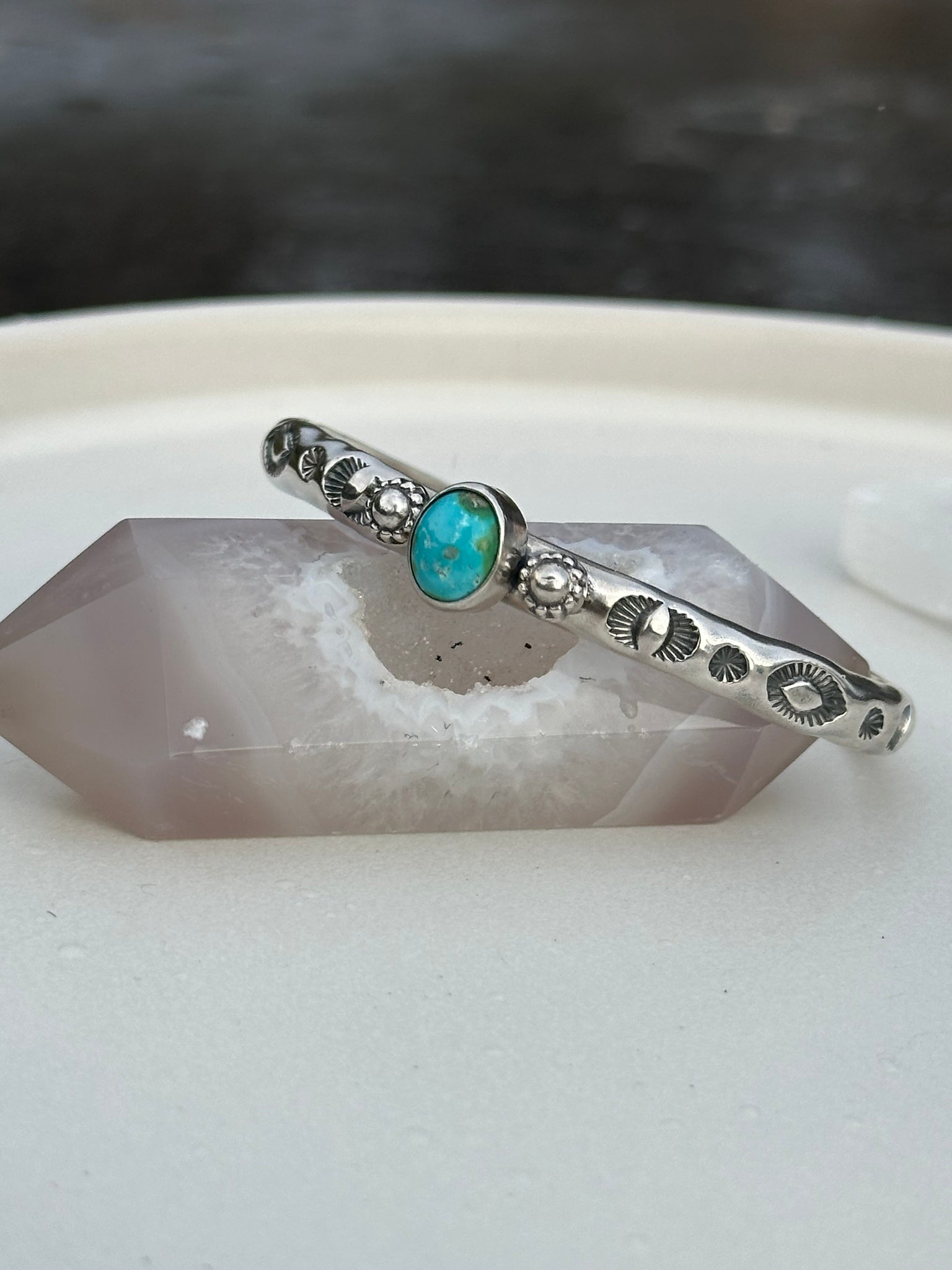 A Hand~Stamped cuff bracelet with a Sonoran Mountain Turquoise & stamped stud details