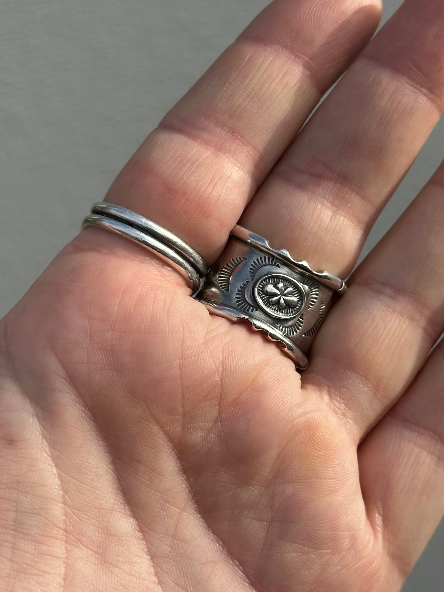 Set on a wide hand~stamped band ft. sawn edge detailing