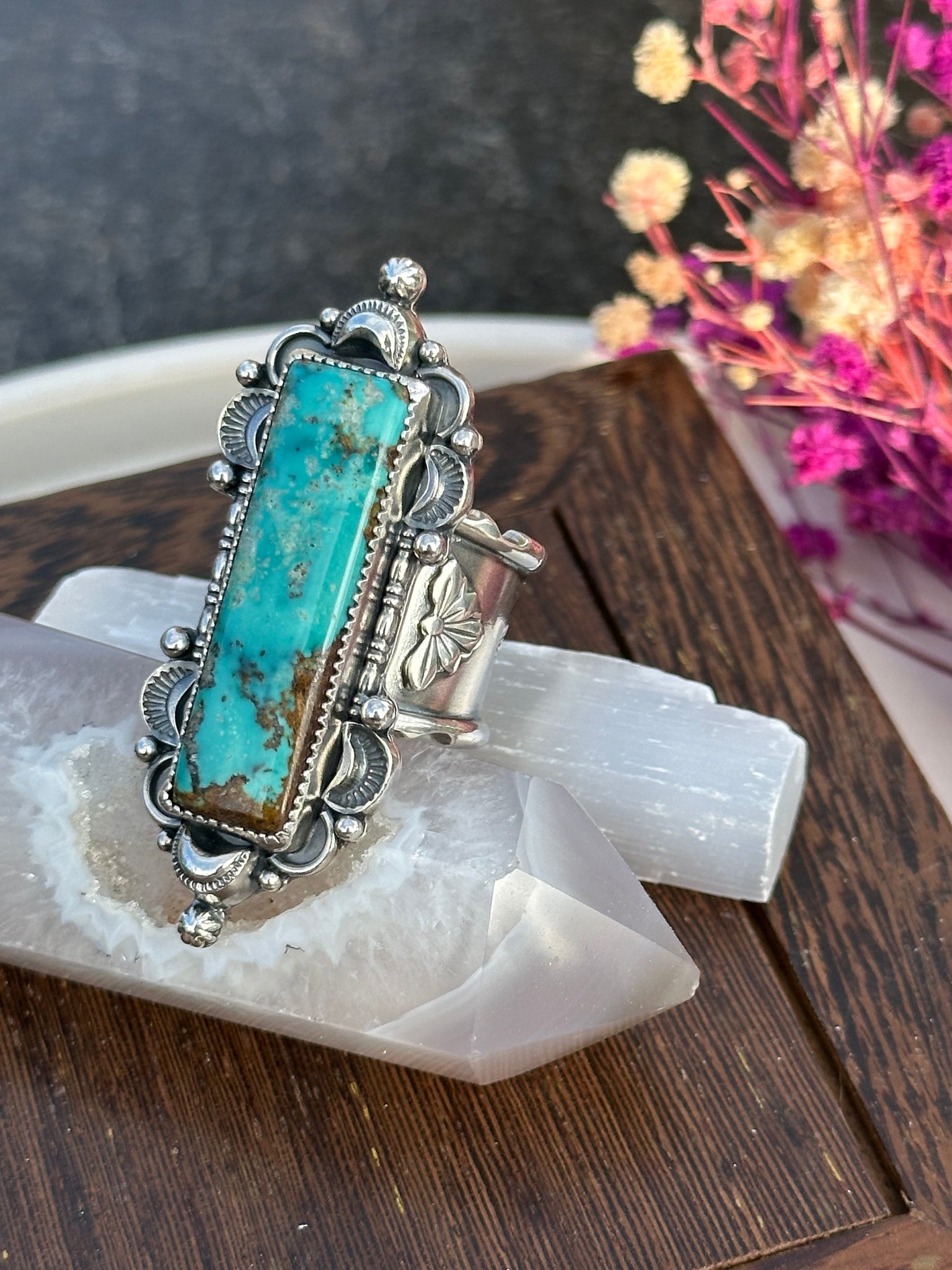 A beautiful blue Hubei Turquoise surrounded by stamp and silver accents