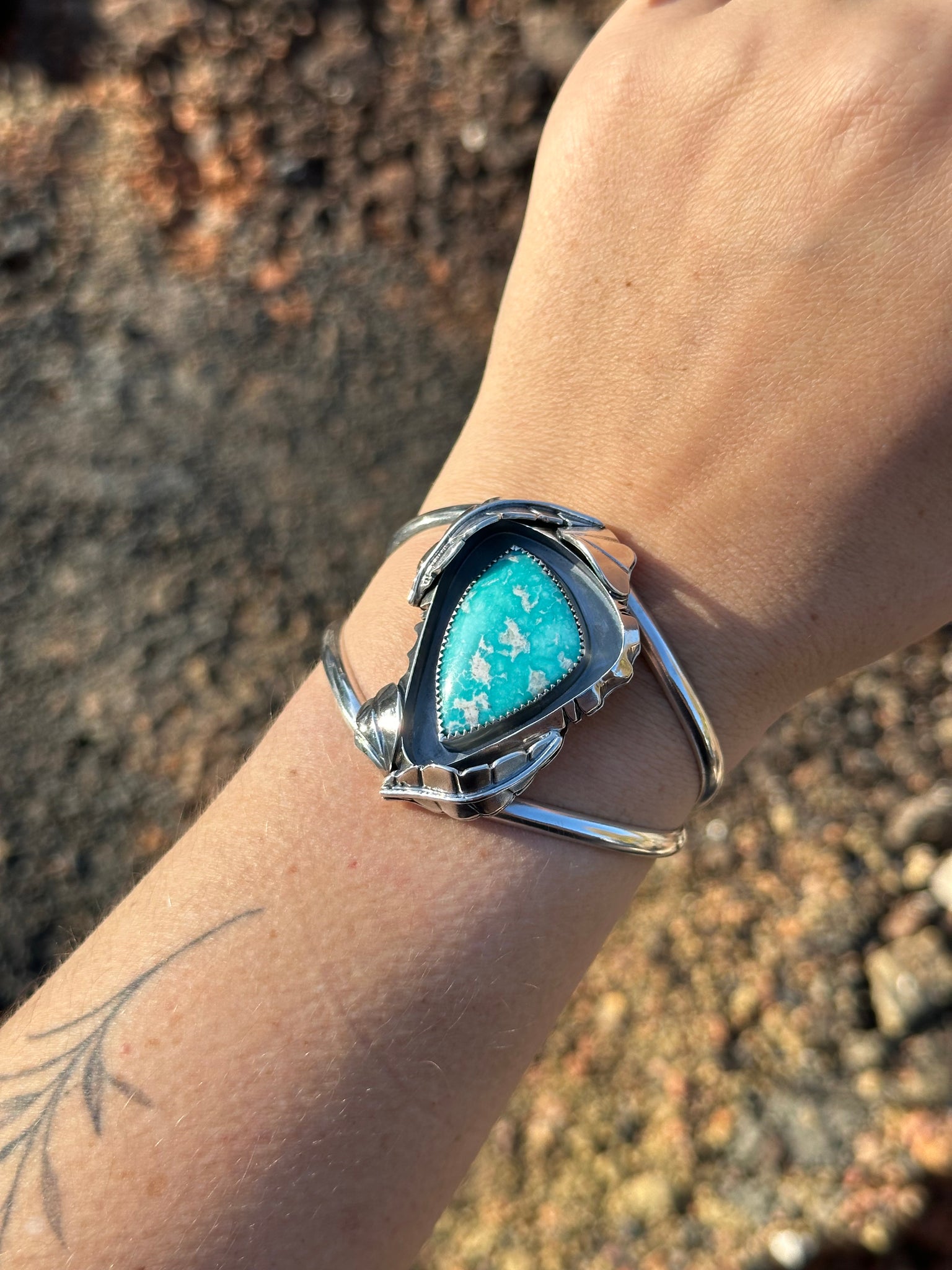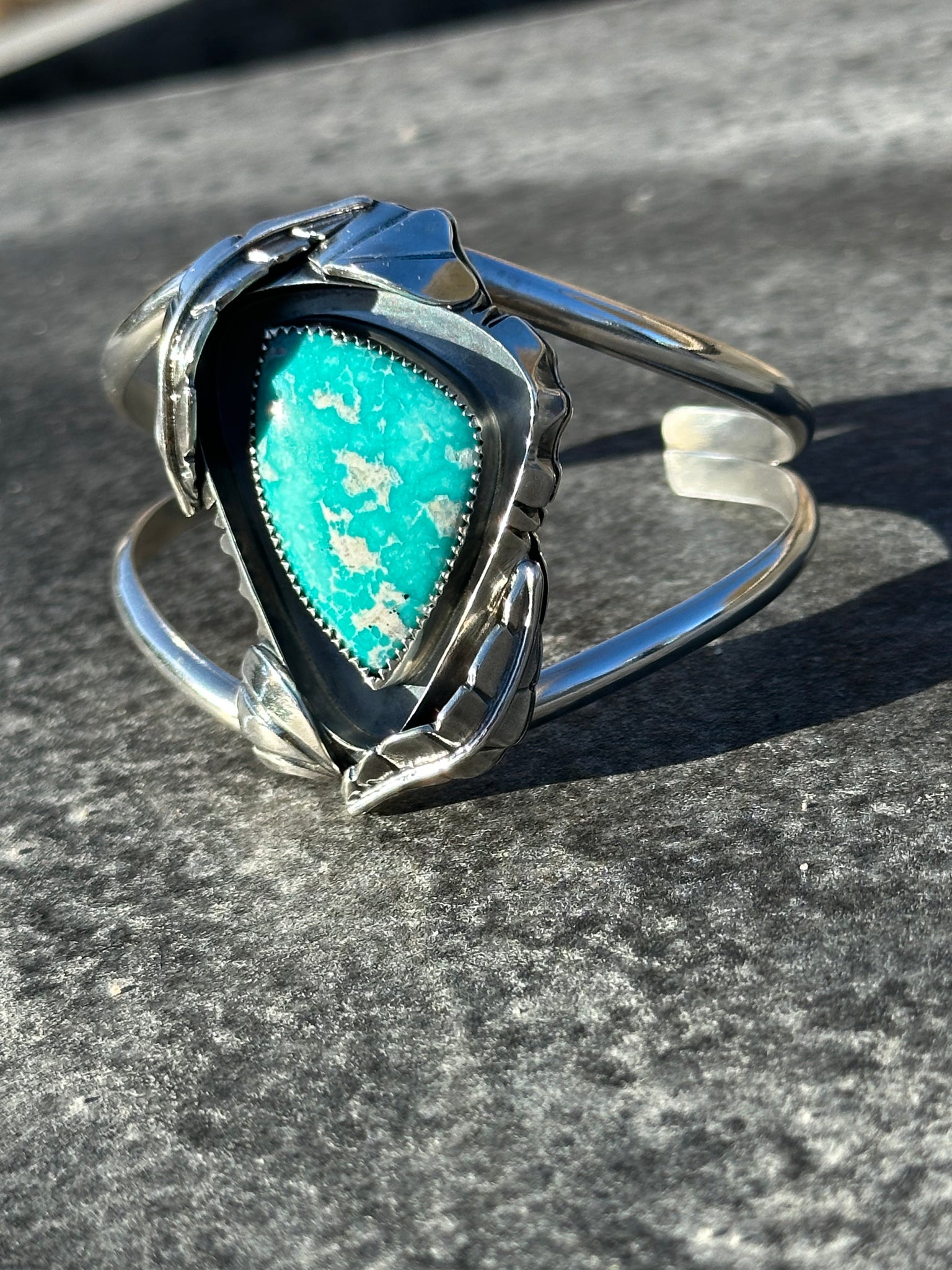 A dreamy Freeform White Water Turquoise framed by a saw~cut border, leaves & silver detailing